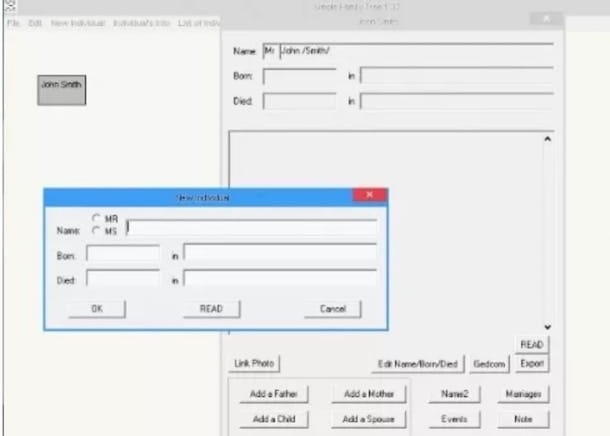 After launching the program, click on the New Individual item in the top menu to add a new family member and enter the data in the fields Name, Born and possibly Died to indicate the date of death. Then place a check mark next to Mr. to indicate the male gender or Ms. for a woman and click the OK button to add the person to your family tree.