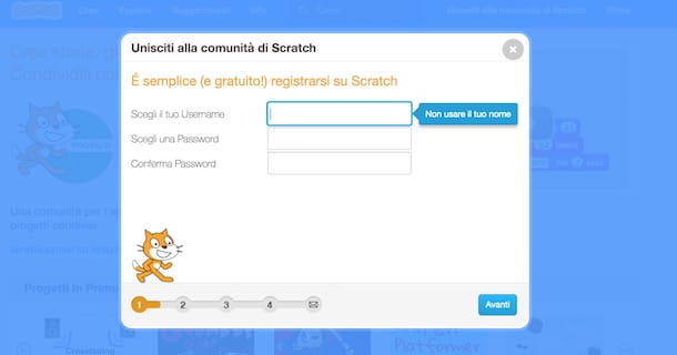To start creating your first project on Scratch online, connect to the main page of the service and, if you have created your account as I indicated in previous paragraphs of this guide, click on the Enter button located in the upper right corner. Enter, then, your login information in the Username and Password fields and click on the Enter button.