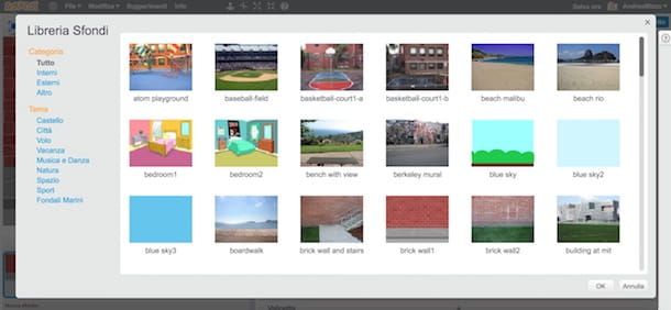 In the newly opened page, you can see the screen divided into three main blocks: on the left is the area containing the characters (called sprites) of your animation; the middle column allows you to set the controls, sounds, background and customize the characters and the right side is for entering the commands that will “move” your sprites.
